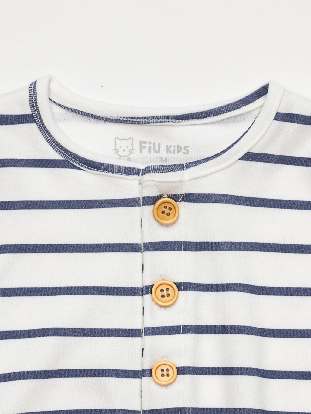 Confeccionado em malha 100% algodão, este do romper listrado com botões bebê menino apresenta listras marinho que trazem um toque clássico e estiloso. Super fresquinho e confortável, ele é ideal para o clima quente, garantindo liberdade de movimento para o bebê. O fechamento é prático, com um elegante botão de madeira na parte superior e botões de pressão entre as pernas, facilitando as trocas e o vestir.